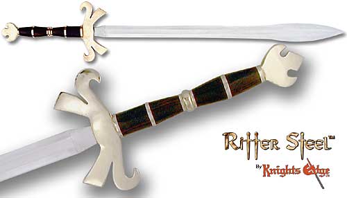 Warlords and warriors rejoice, this two handed battle ready sword for you! The Barbaric lines of this mighty two-handed fantasy sword has attributed to its wide appeal! Each functional carbon steel coal forged flared blade is 2-5/8? at its widest point and reaches 34" in length. The unique brass guard and pommel is cast by hand and a heavy brown leather scabbard is included. Overall length is 47". Item #2008