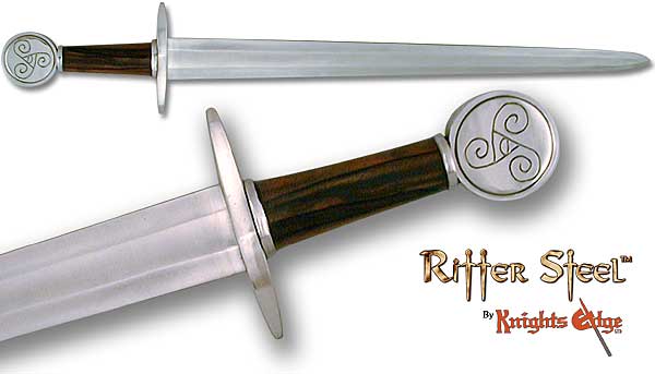 The Early Norse and Celtic people of the middle ages created simple, fully functional swords beautifully adorned with designs from their myths and legends. This beautiful sword has a curled scroll hand-engraved into its pommel... a design found on a ceremonial gilded iron helmet dating to the La Tene era. The original helm resides in the Musee des Antiquites Nationales Museum in France. Leather sheath included. Blade is 1-7/8" wide and 26" long. Overall length 33". Item #2045