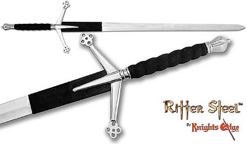 Our fully functional RitterSteel® Scottish claymore sword is a true masterpiece! Each sword is individually made with a thick and solid hand-forged carbon steel blade uniting with a pommel and guard made of steel. The handle made of solid twisted hardwood is sized for two handed use and is covered in black leather for a superb grip. This is the most stunning 2-handed Claymore of 16th century design that you may ever come across, barring an original antique! The blade of this sword is definitely not flimsy like others out there and the balance excels over others in today's market, all for an astonishing price! So if you have the heart of a brave Highland soul, possess this fully functional Steel Great Claymore now! Blade: 2-1/2"W x 45"L. Overall length 59" (no sheath available). Item #2802